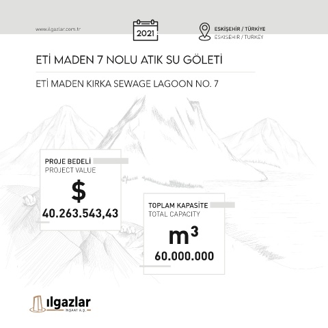 www.ilgazlar.com.tr ESKİŞEHİR / TÜRKİYE 2021 ESKISEHIR / TURKEY ETİ MADEN 7 NOLU ATIK SU GÖLETİ ETİ MADEN KIRKA SEWAGE LAGOON NO. 7 PROJE BEDELİ PROJECT VALUE $ TOPLAM KAPASİTE 40.263.543,43 TOTAL CAPACITY m³ 60.000.000 ılgazlar